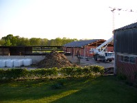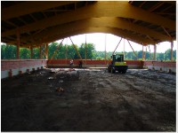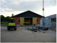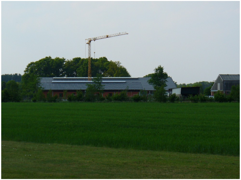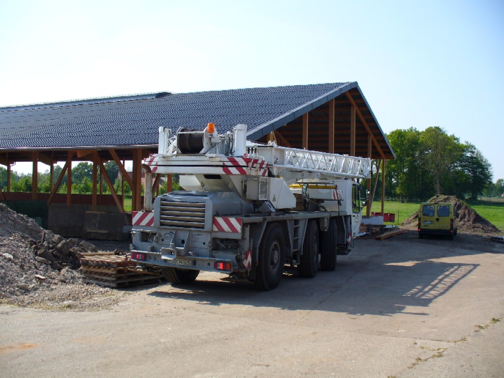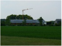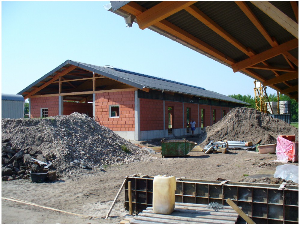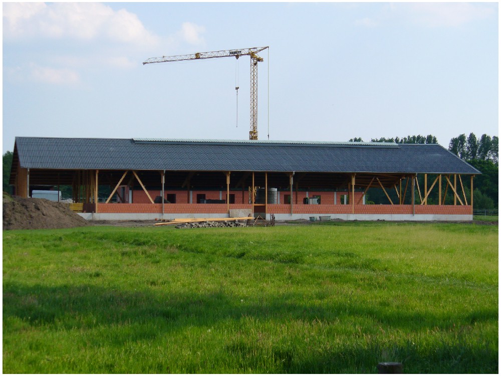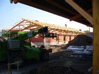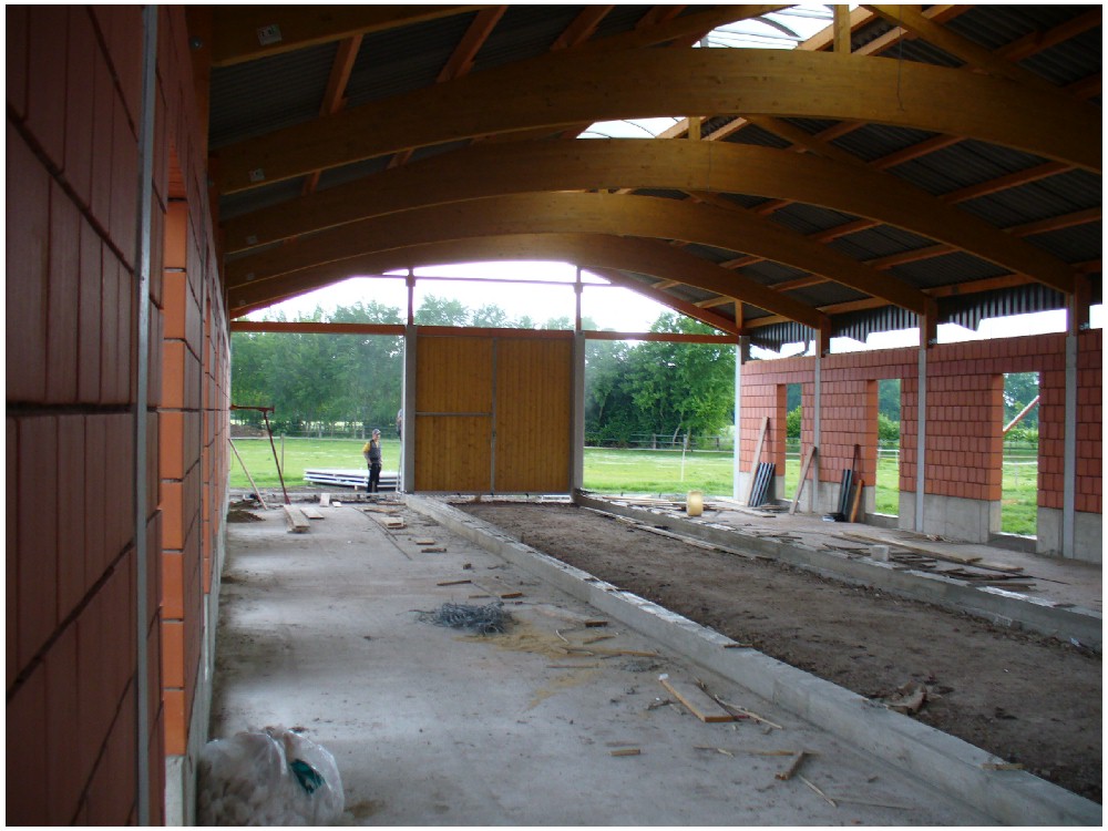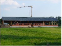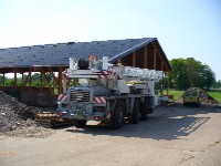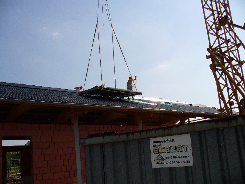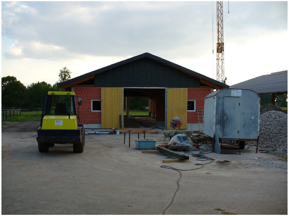 Stand: 08.05.2008 - der Kran von Römmelt geht, der Lichtfirst für den Stall kommt und die Wiese in der Halle wird beseitigt!