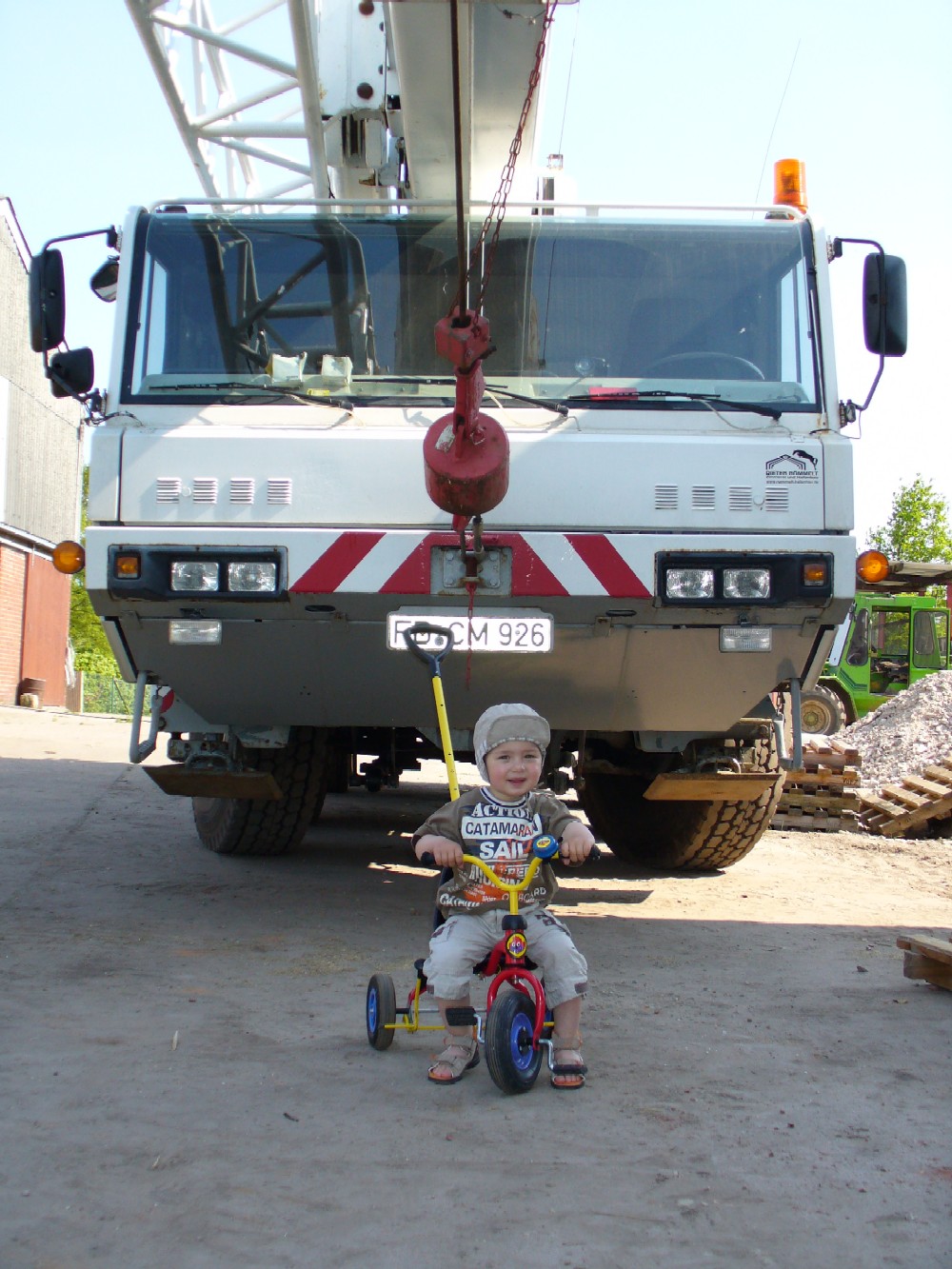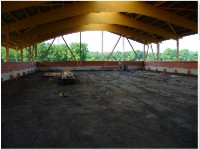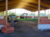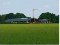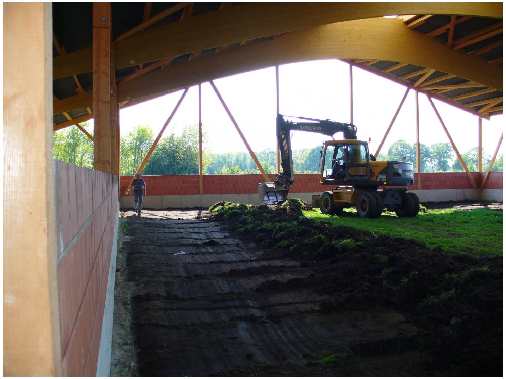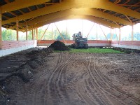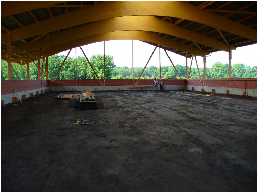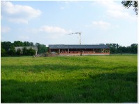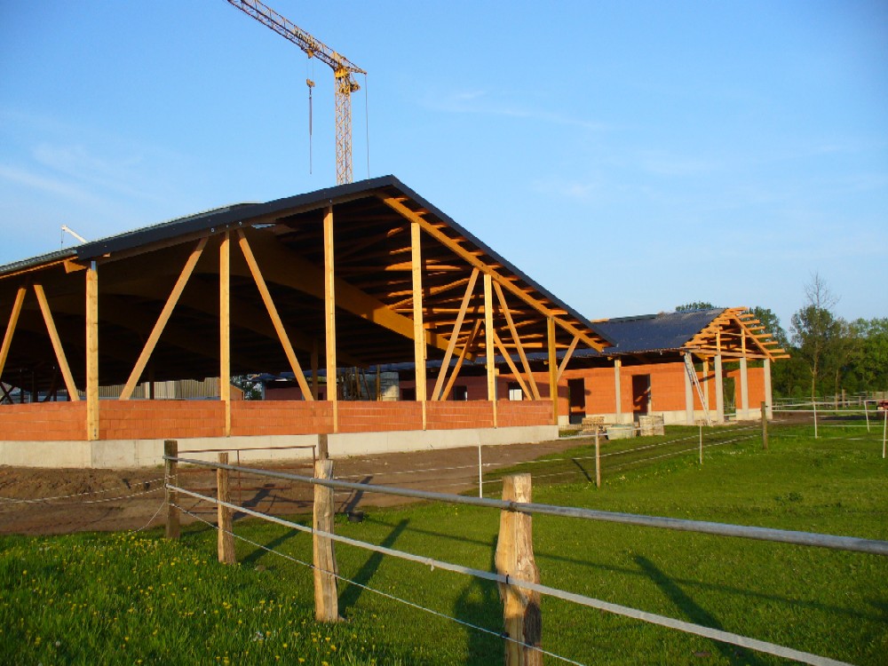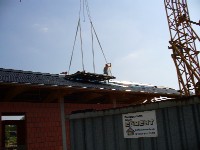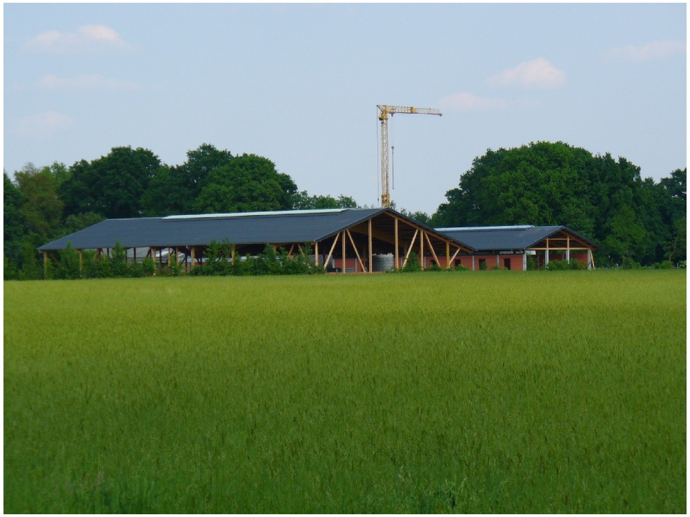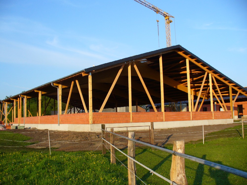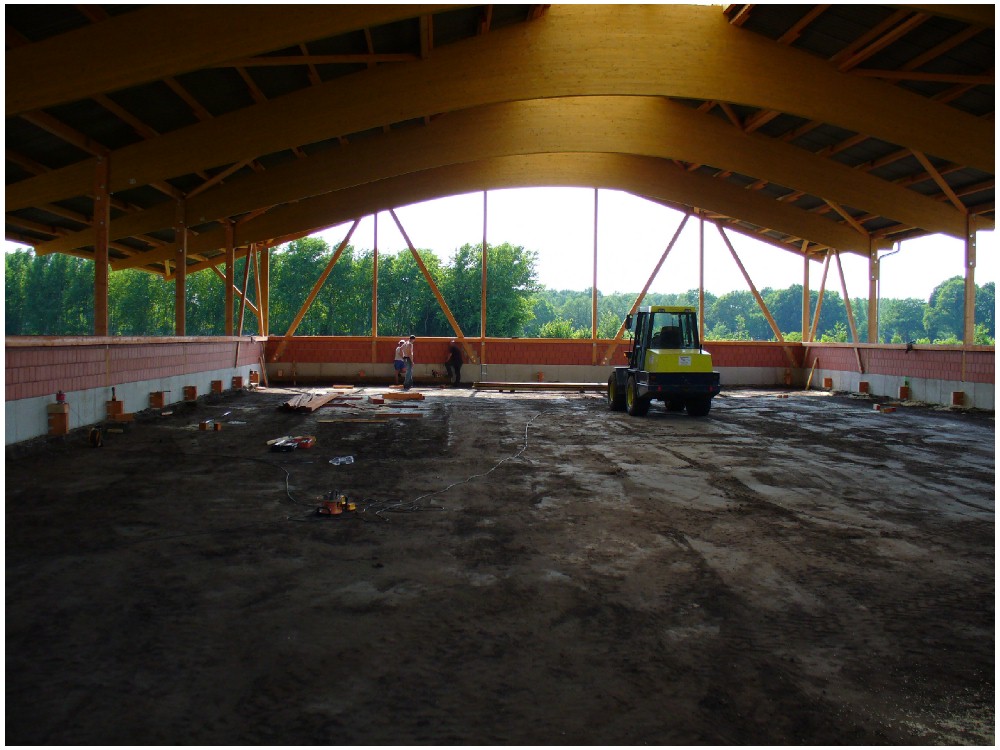 Stand: 08.05.2008 - der Kran von Römmelt geht, der Lichtfirst für den Stall kommt und die Wiese in der Halle wird beseitigt!